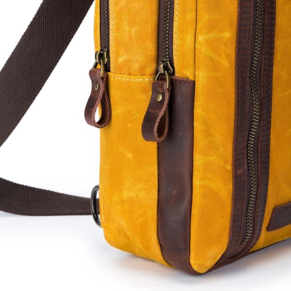 Rugged and stylish, this Maker’s Mini Messenger by Della Q is outfitted with all the necessities for a maker on the go! Made from sturdy waxed canvas and leather, this sling backpack style bag features antique bronze hardware, yarn feeder and cutter, carrying handle at the top, hidden snap pocket on the back, and pockets inside for your hooks needles, or pens.
