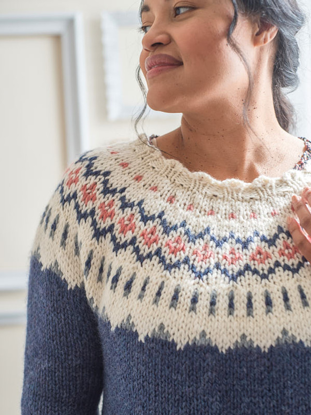 Cozy up under the thickest and warmest knit sweater you’ll ever wear this winter! Hedda features 100% wool Lanas Quick, which is thick and squishy and warm as well as gorgeous in color, with a romantic scalloped neckline, some simple colorwork, and matching colorwork at the sleeve cuffs.